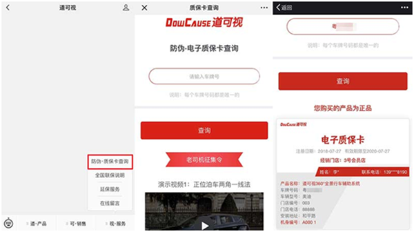 通過電子質(zhì)??ǎ脩艨梢悦赓M(fèi)享受2年的質(zhì)保和全國聯(lián)保服務(wù);可以隨時(shí)查詢產(chǎn)品的售后期限和相關(guān)售后政策;可以查詢到道可視分布全國的銷售網(wǎng)絡(luò);可以查詢到所在城市、地區(qū)的全國聯(lián)保門店,方便就近選擇售后門店;可以在線聯(lián)系官方客服,預(yù)約售后時(shí)間和地點(diǎn)。